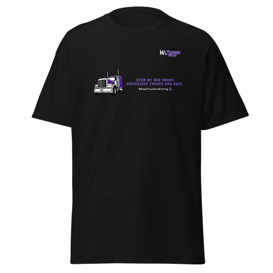 Save The Truckers T-shirt: Even My Dog Knows Driverless Trucks Are Ruff. Purple Truck Edition