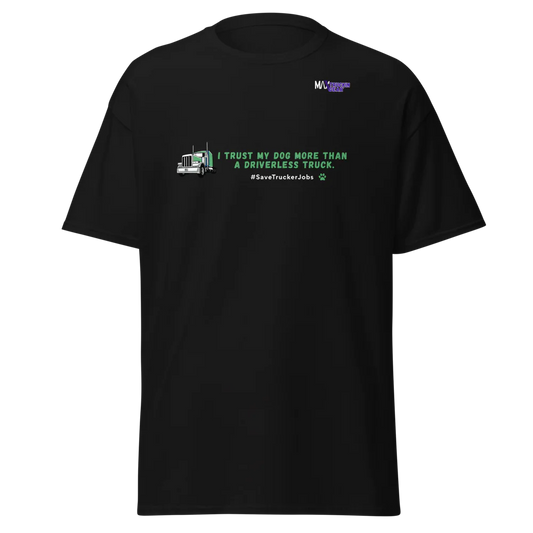 Save The Truckers T-shirt: I Trust My Dog More Than a Driverless Truck. Green Truck Edition